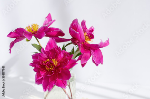 pink, peony, peony, flower, white, background, three, spring, beautiful, bloom, design, day, floral, gift, beauty, summer, nature, blossom, bouquet, love, concept, romantic, mother, fresh, colours, mother, mother, wedding, decoration, holiday, green, valentine, leaf, copy, space, romance, symbol, glasses, jar, wall, decor, composition, decorative, celebration, natural, birthday, rustic, table