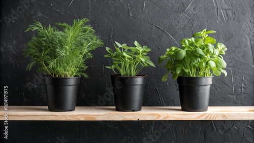 herb, potted, green, plant, kitchen, garden, fresh, culinary, cooking, organic, aromatic, cilantro, basil, dill, parsley, rosemary, thyme, mint, oregano, sage, chives, indoor, home, decoration, shelf, wooden, background, dark, textured, nature, growth, lifestyle, healthy