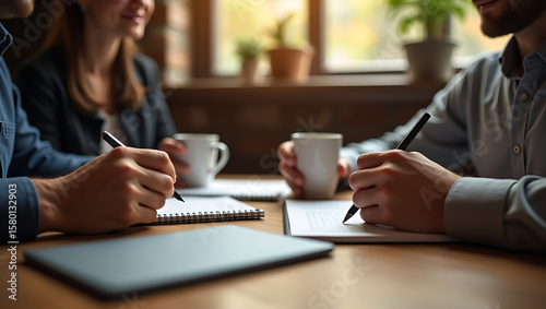 business, meeting, collaboration, teamwork, office, people, writing, notebook, pen, hot drink, mug, table, discussion, strategy, planning, work, professional, agreements, signature, document, analysis, research, startup, corporate, brainstorming, communication, sharpened, concentration, indoor, modern, casual attire, partnership, entrepreneurship, success