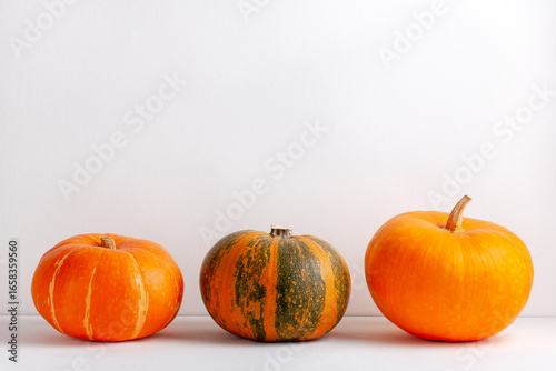 Three pumpkins of different shapes on a white background. Autumn harvest concept, natural food, and seasonal decoration. Perfect for fall, Thanksgiving, Halloween, and healthy eating visuals.