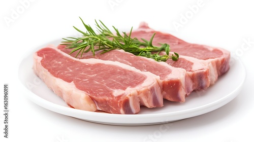 Three raw pork chops on a white plate garnished with rosemary sprigs on a clean white background studio shot