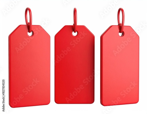tags, red, price, sale, discount, label, retail, shop, merchandise, shopping, store, promotion, marketing, offer, clearance, announcement, blank, empty, paper, cardboard, hanging, string, loop, hole, isolated, background, white, render, three-dimensional, texture, smooth, matte, object, group, three, stack, vertical, graphic, element, illustration, design, presentation, advertising, business, commerce, economy, market, consumerism, value