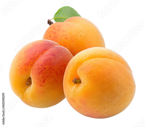 Three ripe peaches with orange and red hues isolated on white background with green leaf attached