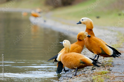Three ruddy shelduck stand on the shore of a pond in the city in the afternoon in spring. Males fight for possession of a female. Behind a very blurry background is water. Copy space