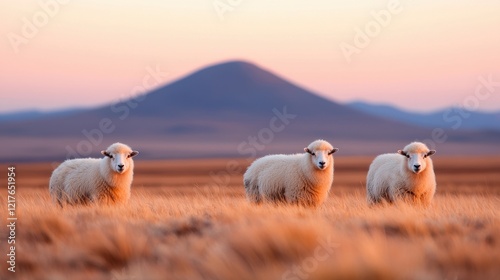 Three sheep stand in a golden field with a soft mountain backdrop during sunrise, capturing a serene rural landscape.