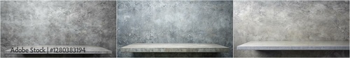 Three shelves with a gray wall in between. The shelves are empty. The wall is made of concrete