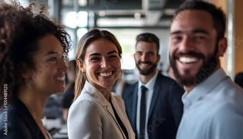 office, professional, business, smiling, happy, people, woman, man, team, co-worker, colleague, workplace, corporate, suit, jacket, attaching, shirt, white, black, brown, hair, curly, straight, face, teeth, eye, beard, background, blur, light, sharpened, indoor, casual attire, formal, group, friendly, confident, success, positive, interaction, connection