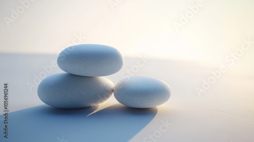 Three smooth white stones stacked gracefully, creating a serene and minimalist aesthetic, perfect for calming designs or backgrounds.