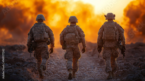 Three soldiers walk in formation, silhouetted against a fiery sunset.