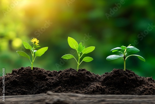 Three stages of plant growth showcasing vibrant leaves and a blooming flower in warm sunlight.