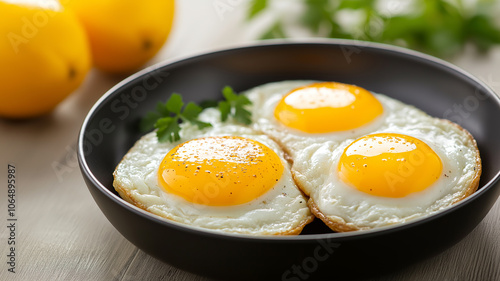 Three sunny side up eggs with vibrant yolks are served in black bowl, garnished with fresh herbs, creating delicious and appetizing breakfast scene