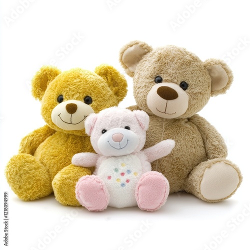 Three teddy bears, studio shot, white background, family, cute, toys, childhood