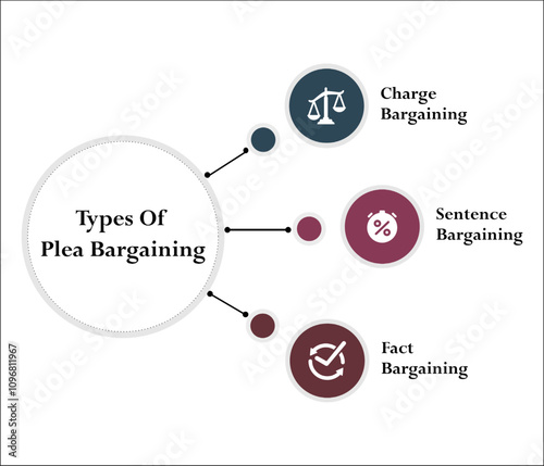 Three types of plea bargaining - charge bargaining, sentence bargaining, fact bargaining. Infographic template with icons and description placeholder