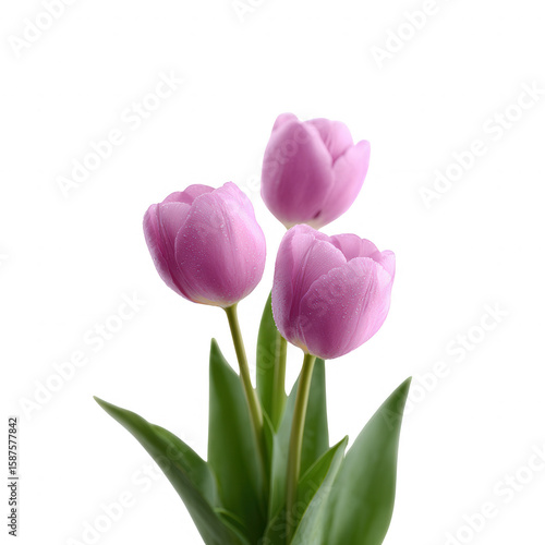 Three vibrant pink tulips with lush green leaves, set against a white isolated background, perfect for nature-themed decor or floral arrangements.