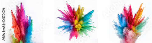 Three vibrant powder explosions in different color combinations against a white backdrop.