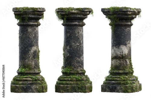 Three weathered stone pillars, covered in moss and lichen, isolated on white