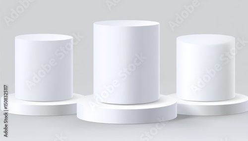 Three white cylinder podiums on light gray background