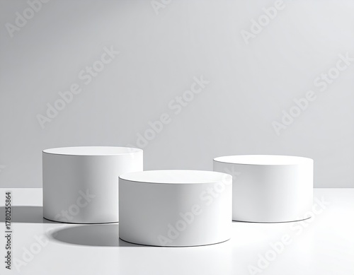Three white cylinder stands, minimalist, in bright light