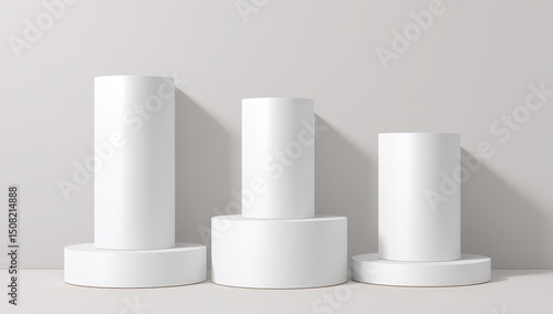 Three white cylindrical podiums, ascending in size, on light gray background