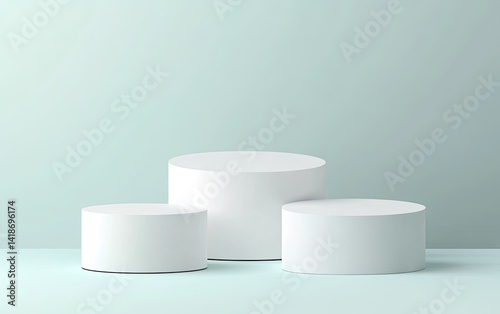 Three white cylindrical podiums on a light-blue background.