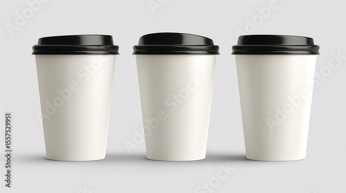 Three white paper coffee cups with black lids, mockup template for design presentation on light background, high-resolution.