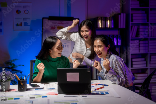 woman, celebrate, room, white, board, laptop, happy, celebratory, female, young, group, person, business, teamwork, computer, asian, office, team, businesswoman, meeting, beautiful, sitting, working, technology, professional, modern, education, creative, corporate, portrait, table, japanese, desk, adult, job, student, attractive, together, indoor, concept, connection, communication, discussion, school, occupation, online, study, muslim