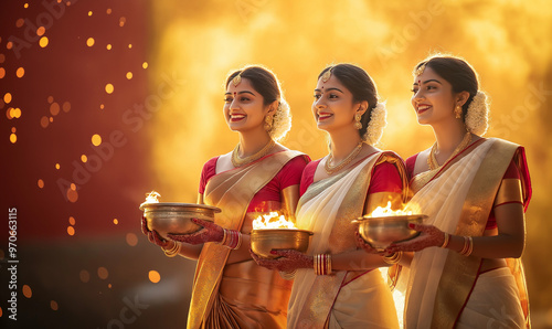 Three women wearing saris and holding kalashes in their hands, standing together and smiling, performing a cultural festival