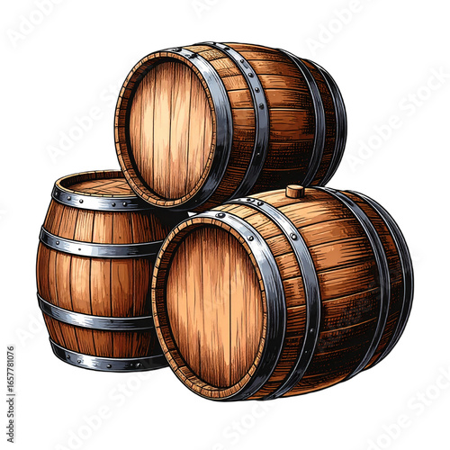 Three wooden barrels with metal bands, illustrated with detailed wood grain and shading, showing classic storage containers typically used for aging liquids