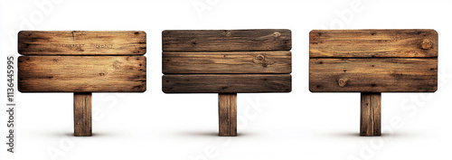 Three wooden signboards of different shapes, front view, isolated on a white background