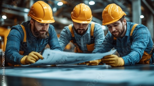 Three workers in protective gear carefully examine blueprints at a workbench in a busy workshop, emphasizing teamwork and precision in their tasks