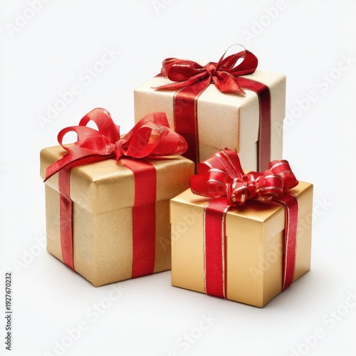present, gift, box, wrapped, ribbon, red, gold, white, celebration, surprise, festive, holiday, christmas, birthday, package, treat, giving, receiving, isolated, studio, closeup, detail, texture, shiny, square, cubic, ornament, bow, decoration, elegant, luxury, pattern, gold, metallic, light, shadow, stacked, arrangement, group, sharpened, foreground, background, plain, simple, bright, modern, present, exchange, occasion