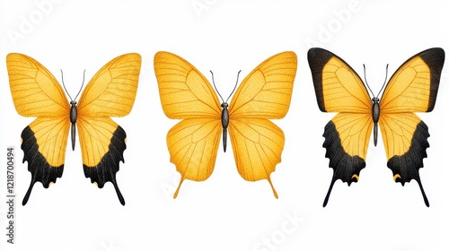 butterfly, yellow, black, marking, insect, entomology, wildlife, nature, wing, wing, three, butterfly, white, background, isolated, closeup, macro, detailed, specimen, insect, fauna, animal, animal, collection, display, arrangement, row, variation, pigmentation, composition, visual, attracted, ornate, elegant, artistic, natural, beauty, symmetry, colours, pattern