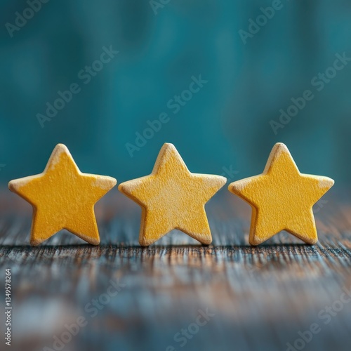 Three Yellow Wooden Stars on Rustic Wooden Surface Representing Three Star Rating Customer Feedback Review Score