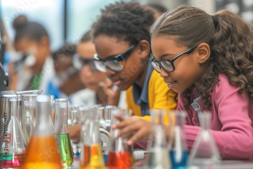 Three young girls in science lab, inspecting chemicals, teamwork in action, excitement for learning, colorful experiment. Trio of female students engage in chemistry lab, curiosity sparkles