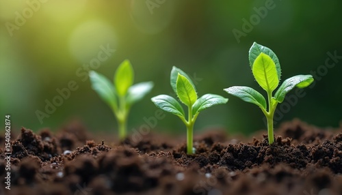 Three young green plants growing fertile soil. Symbol of new life and nature resilience. Plants symbolize spring time, eco-friendly growth, nature, green life, environment and gardening.