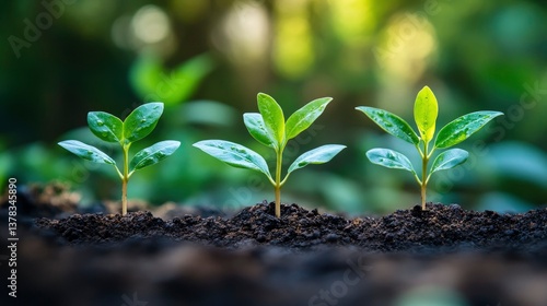 Three Young Seedlings Growing in Rich Soil, Representing Growth, New Beginnings, and Environmental