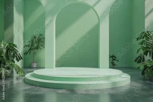 green, studio, limbo, dais, scene, geometric, blank space, concept, empty, three-dimensional, floor, background, modern, space
