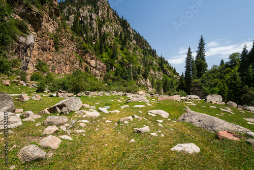 travel, mountain, tian, fir, spruce, kyrgyzstan, gorge, canyon, range, massive, view, panorama, panoramic, tour tourism, central, asia, east, eastern, nature, landscape, summer, day, sunny, tree, forest, scene, scenic, green, beautiful, nobody, stone, rock
