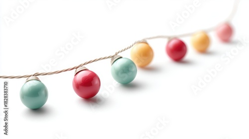 Tidy rolled string of colorful Christmas light bulbs on a white background, creating a festive atmosphere for holiday celebrations and decorations