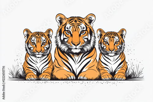 tiger, family, illustration, baby animal, sitting, animal, wildlife, nature, orange, black, stripes, felino, predator, big cat, jungle, safari, wild, mammal, drawing, art, design, graphic, vignetting, cartoon, cute, adorable, eltern, children, grass, environment, habitat, conservation, endangered, species, portrait, symmetry, pattern, detail, texture, bold, vibrant, expressive, character, peaceful, serene, harmony, oneness, bond