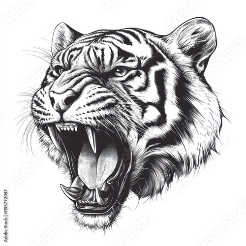tiger, roar, animal, head, wildlife, mouth, illustration, felino, drawing, graphic, predator, danger, striped, mammal, big, cat, isolated, aggressive, wild, teeth, black, white, fierce, jungle, carnivore, nature, powerful, strength, ink, art, vignetting, portrait, face, closeup, pattern, design, print, growl, open, expression, attack, hunter, asian, fury, bengal, vector, painted