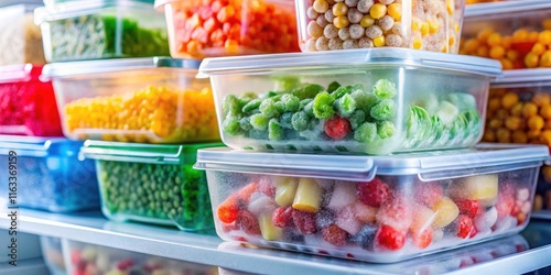 Tilt-Shift Photography of Colorful Plastic Containers in a Freezer, Showcasing Frozen Foods and Ingredients for Culinary Enthusiasts and Home Chefs