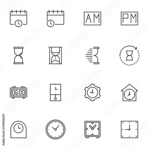 Time line icons set, outline vector symbol collection, linear style pictogram pack. Signs, logo illustration. Set includes icons as calendar reminder, hourglass, clockwise arrow, alarm clock, watch