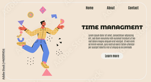 Time management banner. Multitasking, productivity, skillful concept. Man balances on a triangle and juggle abstract shapes. Modern vector cartoon flat illustration in trendy colors