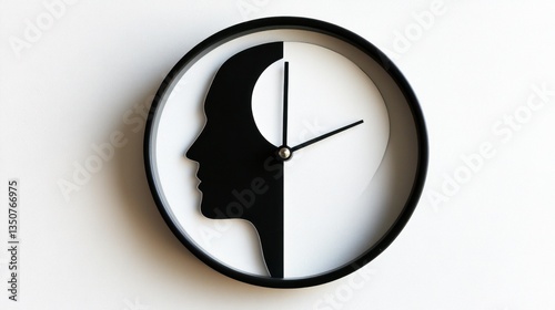 clock, time, head, silhouette, management, mind, thought, concept, design, minimalism, black, white, wall, modern, abstract, art, interior, decor, symbol, icon, analog, hand, face, profile, home, office, style, creative, graphic, simple, elegant, contemporary, decoration, object, round, shape, monochrome, image, background, still life