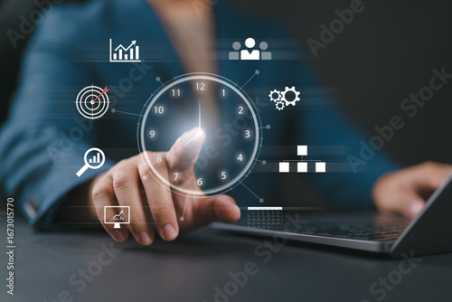 Time management concept. A person touching clock icon on virtual to work planning for increases efficiency and reduces work time. Business project planning.