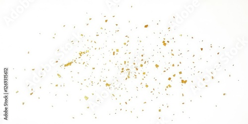 Tiny golden flake fragments scattered randomly across a pristine white surface, scattering, gold foil, fragment