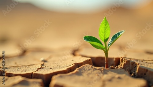Tiny green shoot growing out of dry cracked ground in desert landscape, nature, brown