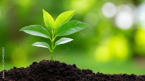 Tiny plant sprouting from soil new life begins green shoot pushing through rich soil sign of growth.