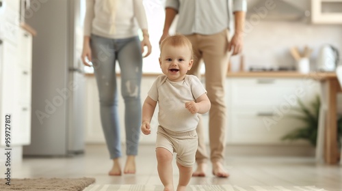 Tiny Steps, Giant Leaps: A joyful toddler takes confident strides towards the camera, the loving presence of his parents in the background embodying the warmth and support of home.